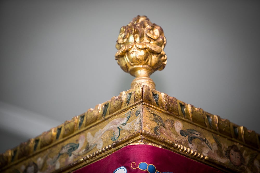 A major task was to dismantle the 17th century four-poster giltwood bed in order for it to travel to Yannick Chastang Conservation Studio, where it received essential conservation treatment to make it more structurally sound. The bed had been modernised and radically altered in the mid-20th century.