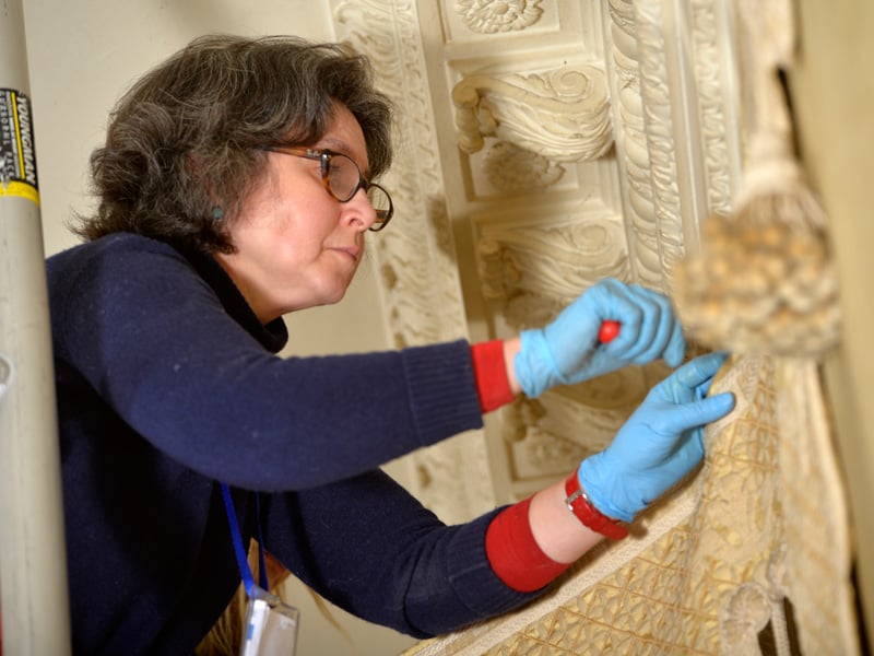 Paint research was carried out on the cornice which identified it as a distemper paint which required special method of cleaning using triamonium citrate. This had to be done by hand and was carried out using in house expertise within the Heritage team at Leeds Castle.